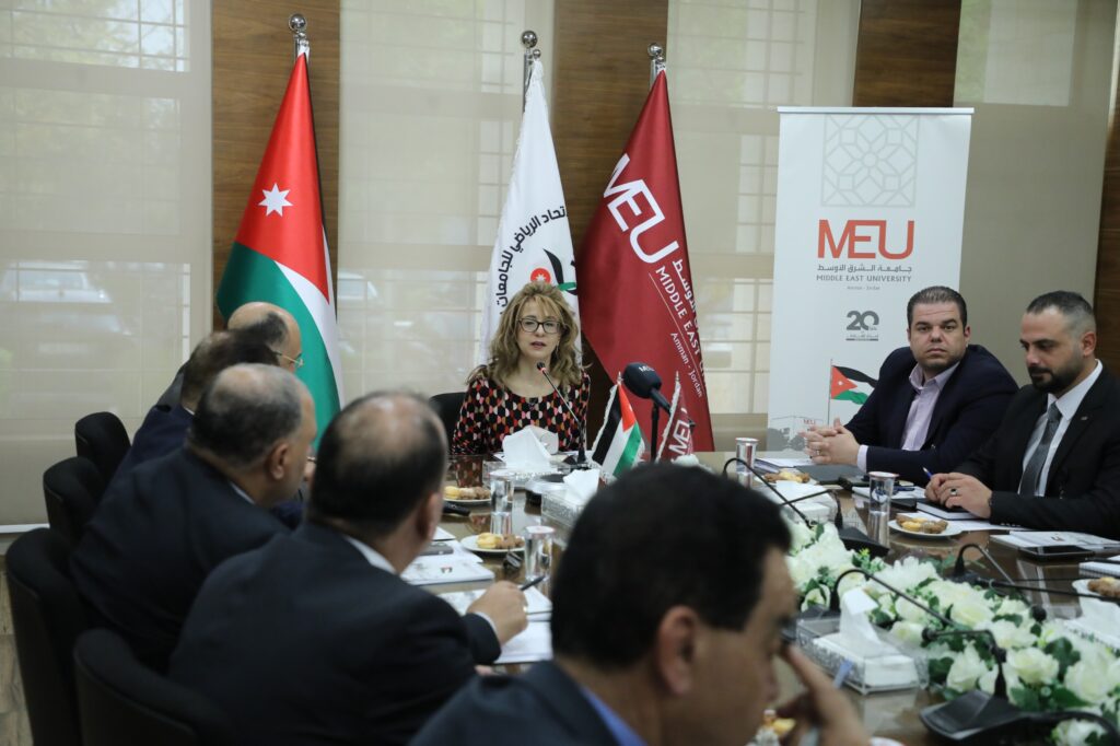 عقد في جامعة الشرق الأوسط الاجتماع الأول للهيئة الإدارية للاتحاد الرياضي للجامعات الأردنية للعام الجامعي 2025/2026 برئاسة عطوفة الأستاذة الدكتورة سلام المحادين رئيسة الاتحاد الرياضي للجامعات الأردنية/ رئيسة الجامعة وبحضور عمداء شؤون الطلبة في الجامعات الأردنية الحكومية والخاصة لمناقشة عدد من القضايا التنظيمية والإدارية والفنية المتعلقة بالاتحاد الرياضي للجامعات الأردنية تأكيدًا على أهمية تعزيز التعاون بين الجامعات الأعضاء وتطوير البنية الإدارية والفنية للاتحاد بما يسهم في رفع مستوى الرياضة الجامعية في الأردن وتحقيق اهداف الاتحاد الرياضي للجامعات الأردنية وترسيخ روح المنافسة الشريفة والانتماء الجامعي بين الطلبة.